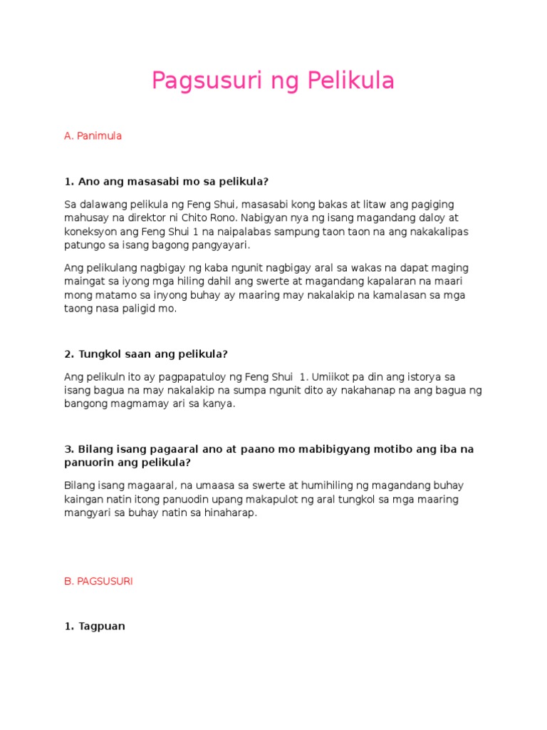 Sa Ingles ito ay tinatawag na outline. Banghay ng mga Pangyayari Sa kabuuan ang banghay ng palabas ay maayos at hindi naging mahirap unawain kung paano naging konektado ang bawat pangyayari. 233192758-Suring-Pelikula-at-Banghay-Ng-El-Fili-Last-Topic - Pangalan_Seksyon_Petsa Pagsulat ng Isang Rebyu 1 Buod ng pelikula u2013 ang kabuuang.