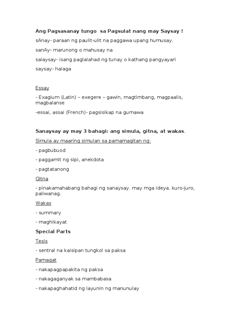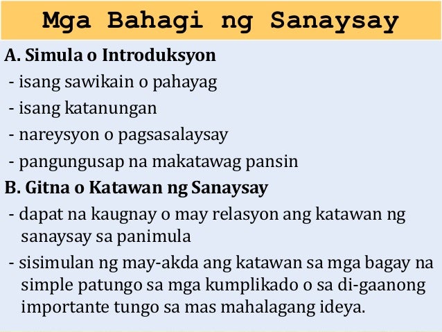 Dalawa lang ang sanhi kapag nahihirapan magsulat ng sanaysay. Mga Bahagi ng Sanaysay. Pangalawa ay dahil sobrang dami kong alam sa.
