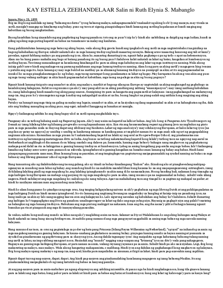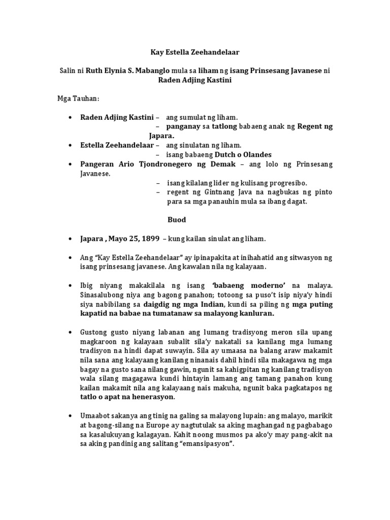 Tinutukoy ay ang Kay Estella Zeehandelaar isinalin ito sa ating wika ng magaling na manunulat na si Ruth Elynia S. What is the summary of Kay Estelle Zeehandelaar. Ang kay estella Zeehandelaar ay mula sa mga liham ng isang Prinsesang Javanese kung saan ipinapakita at inihahatid nito ang sitwasyon ng isang prinsesang Javanese.